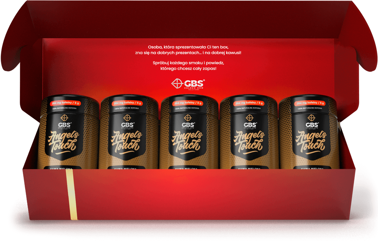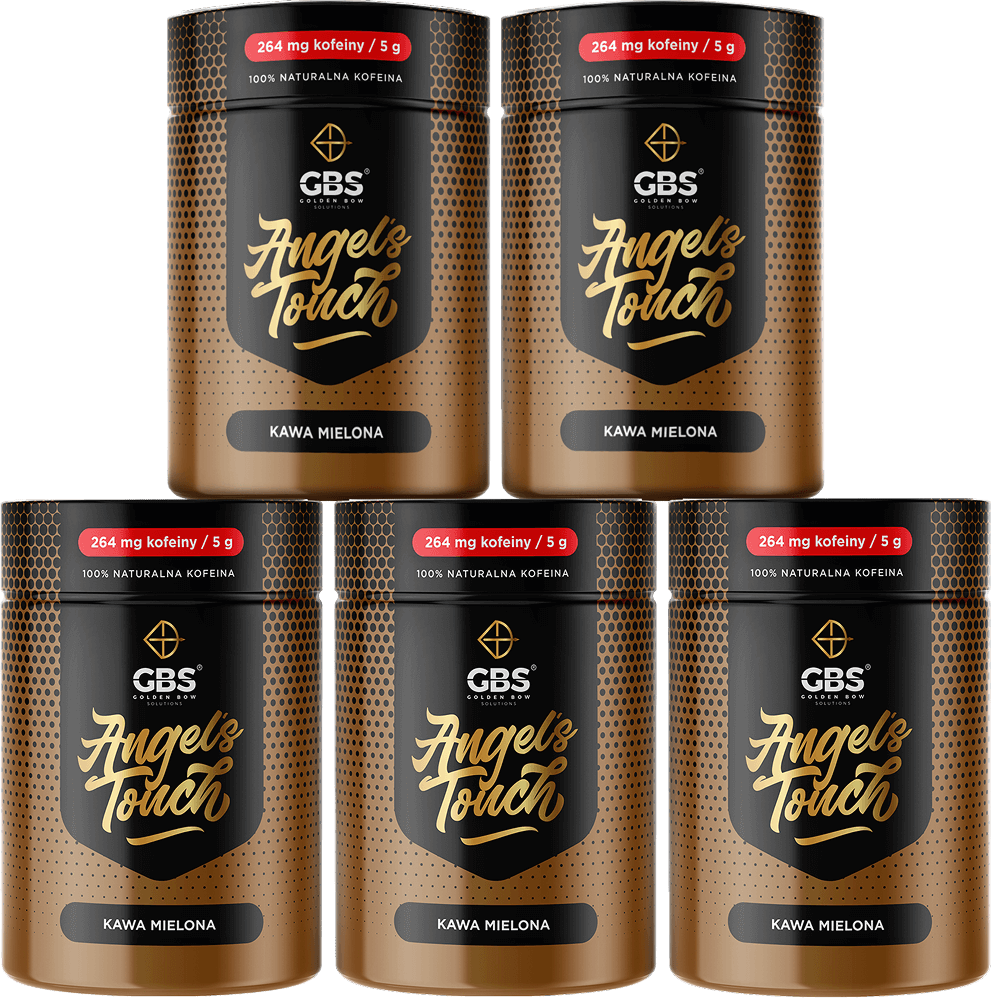 Prezentowy zestaw kaw Angel’s Touch to sprawdzony, uniwersalny wybór. W środku 5 kaw o zwiększonej zawartości kofeiny (264 mg), każda starczy na 4 porcje, smaki: batonik wafelkowy, karmel, kruche ciasteczko, masło orzechowe i niearomatyzowana.